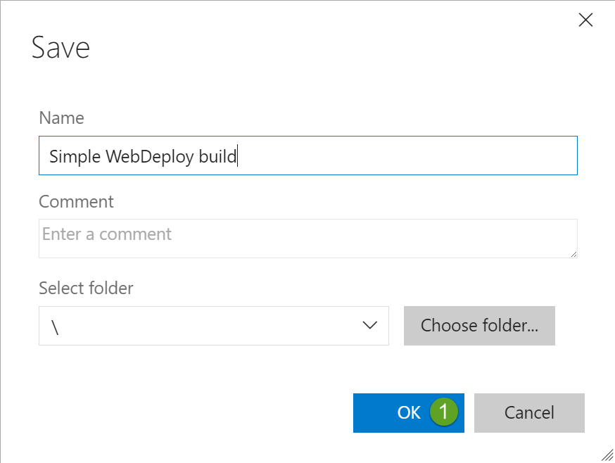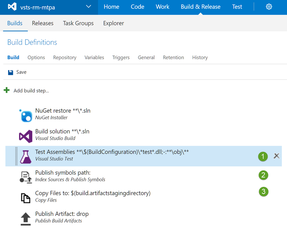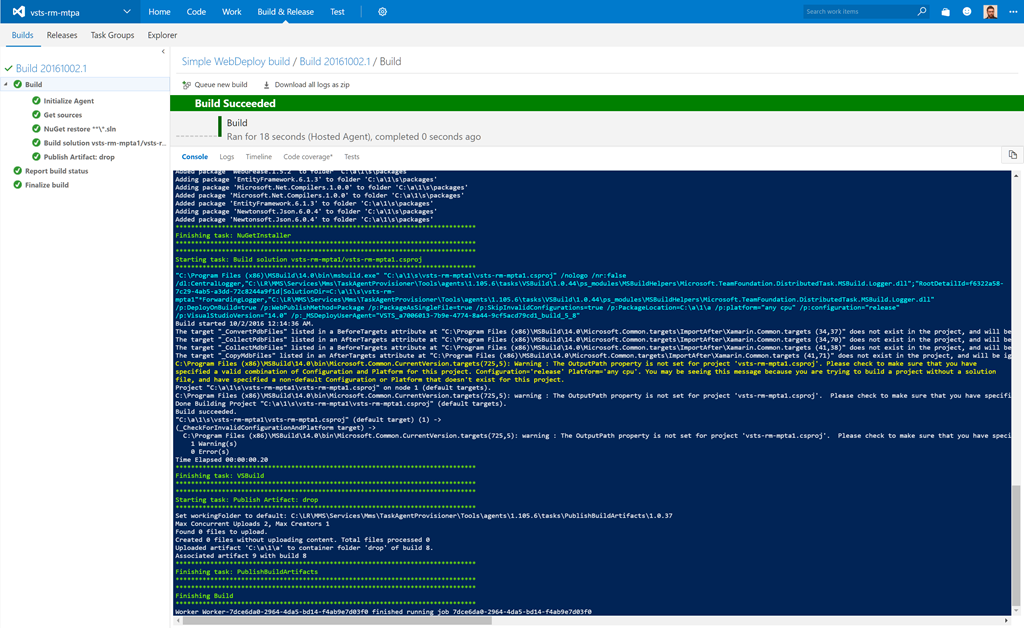 This creates a web deploy package which we will use in the release process writing it directly into the folder which is used in the Publish Artifact task.