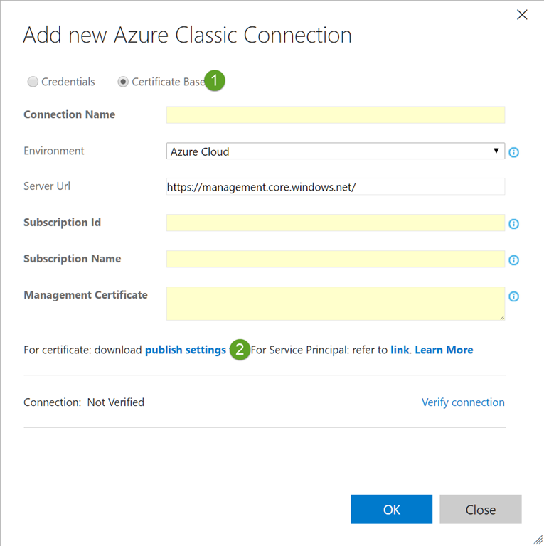 You could choose to use a Credentials based connection if you like, I prefer a certificate based connection as it’s not going to become invalid if the password of the user account used changes. Select the Certificate Based Radio button and click on the publish settings link.You may need to sign in to your Azure account.