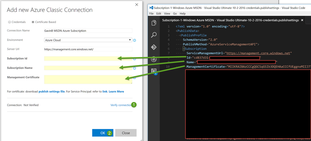 Open the .publishsettings file that downloads, copy over the corresponding values, click verify connection and once the connection is verified click OK.