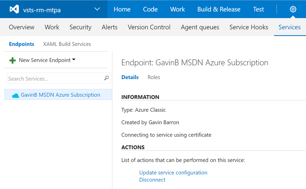 Now with a connection established between Visual Studio Team Services and your Azure Subscription you’re ready to create a release process.