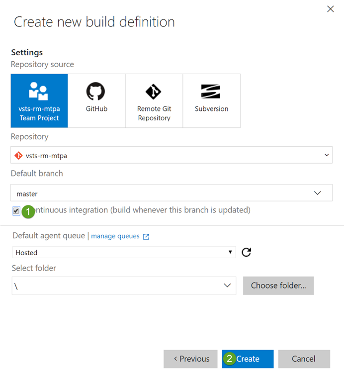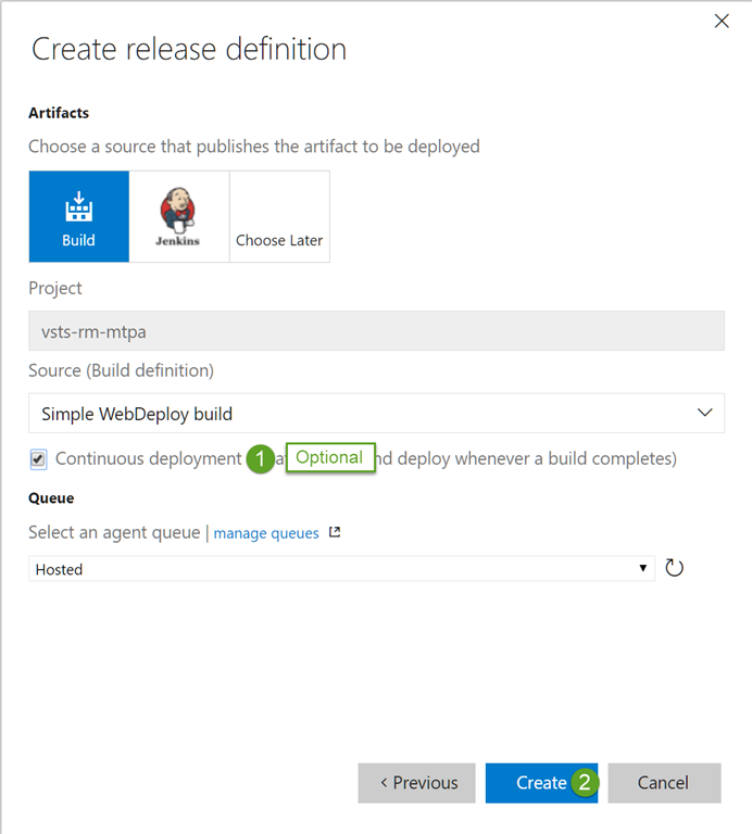 On the next pane of the dialog you can choose to turn on Continuous Deployment. This will result in each successful build of the linked build definition triggering an automated release. As you only have one build definition at this stage it’s automatically selected as the default, so just click on Create