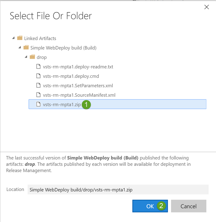 Use the file explorer to locate the vsts-rm-mpta1.zip file in the build output.