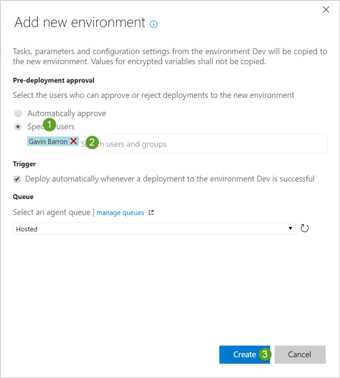 In the add new environment dialog let’s assign an approver so that we have a sign off process before deploying to production for our simple process and then click Create