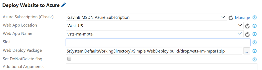 In the configuration pane for the Deploy Website to Azure task select your newly configured connection in the Azure Subscription (Classic) drop down. Choose the region that you deployed your target Azure Web App in. In the Web App Name type in the name of your Web App, the values that appear in the drop down are only the web site associated with the default service plan in the selected region so don’t be surprised if you don’t see the target website listed.