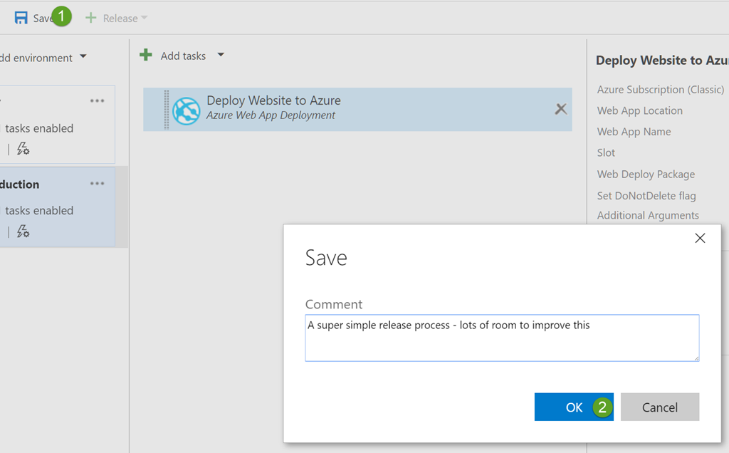There are plenty of other ways that this could be configured, for example we could have our Production environment not use a web deploy task but run a script to swap the dev and production slots. We could use Azure Resource Manager to provision or update our environments. We might want to set Application Configuration specific to the environment that is being deployed into. I’m planning on covering each of these three scenarios in future blog posts.