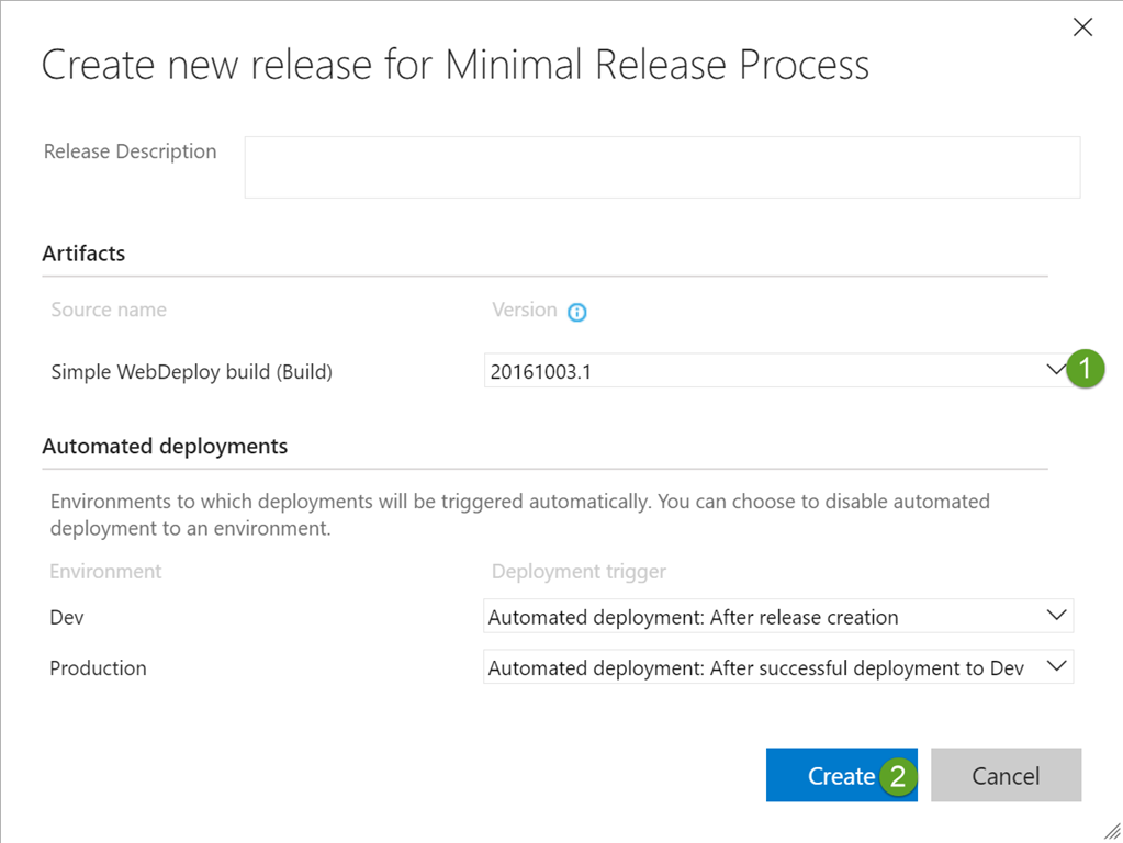 Select the version of your build that your want to deploy with this release. You can also see here that you can change the deployment triggers for each of the environments that you have configured, in this case we’ll leave the options as configured in the release process and click Create.