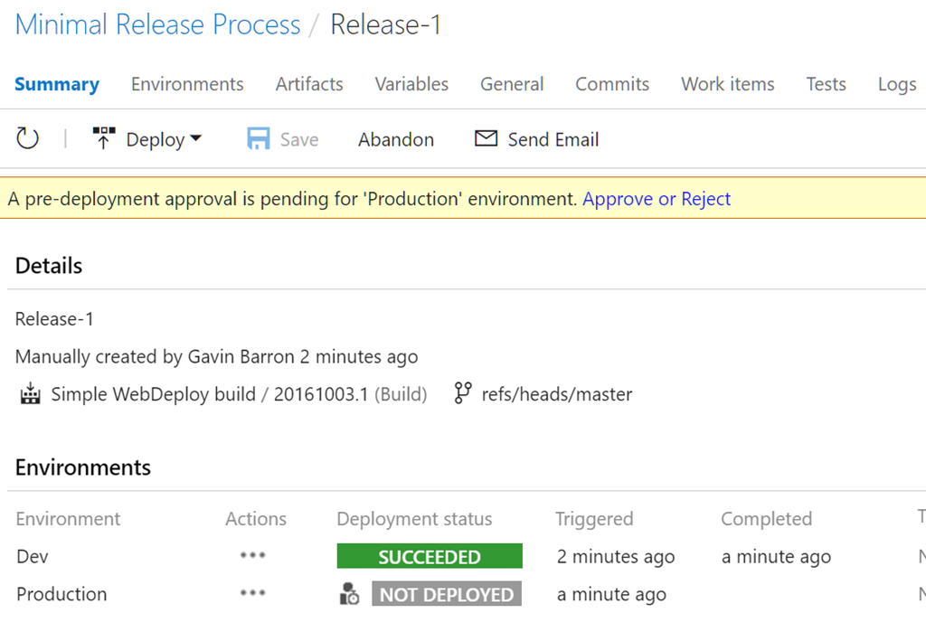 After the release into the Dev environment has succeeded you can see that there is an approval to deploy to production pending. The users listed as approvers will also receive an email notifying them that there is a deployment pending approval too.