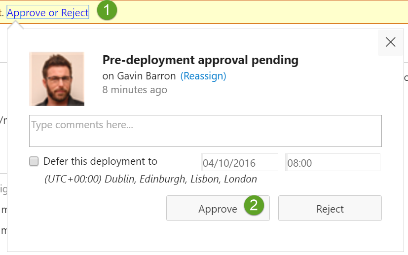 Click on Approve or Deny and choose to approve the Production deployment. You’ll note here that you can differ the deployment to a later date, this can be extremely useful if your customer requires a 3am deployment (although you’ll probably want to wake up and verify that all is good after the deployment)