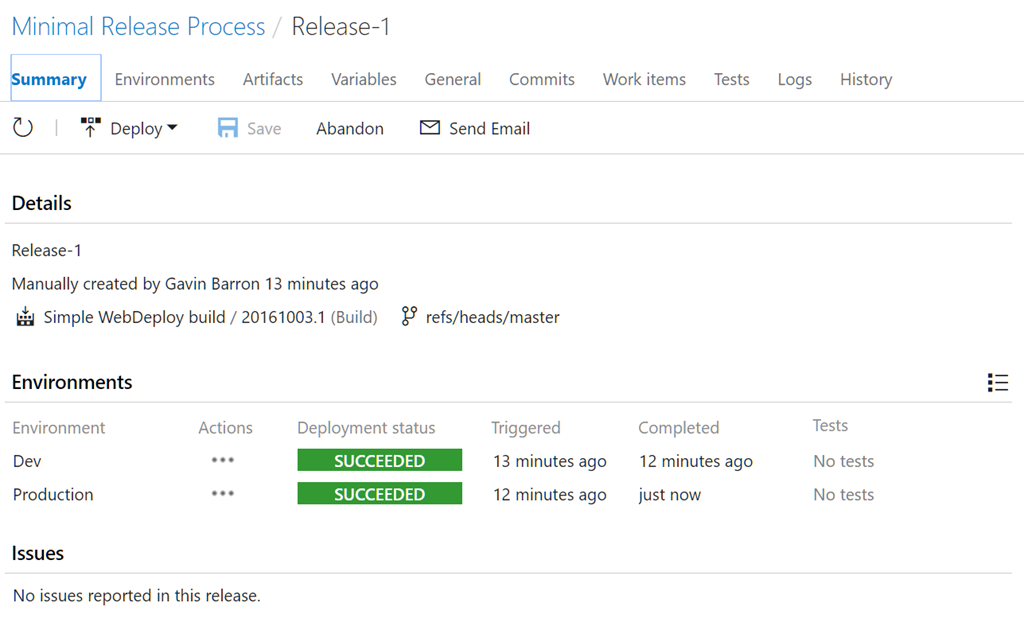 Congratulations, you’ve successfully configured a simple release process using VSTS Release Management.