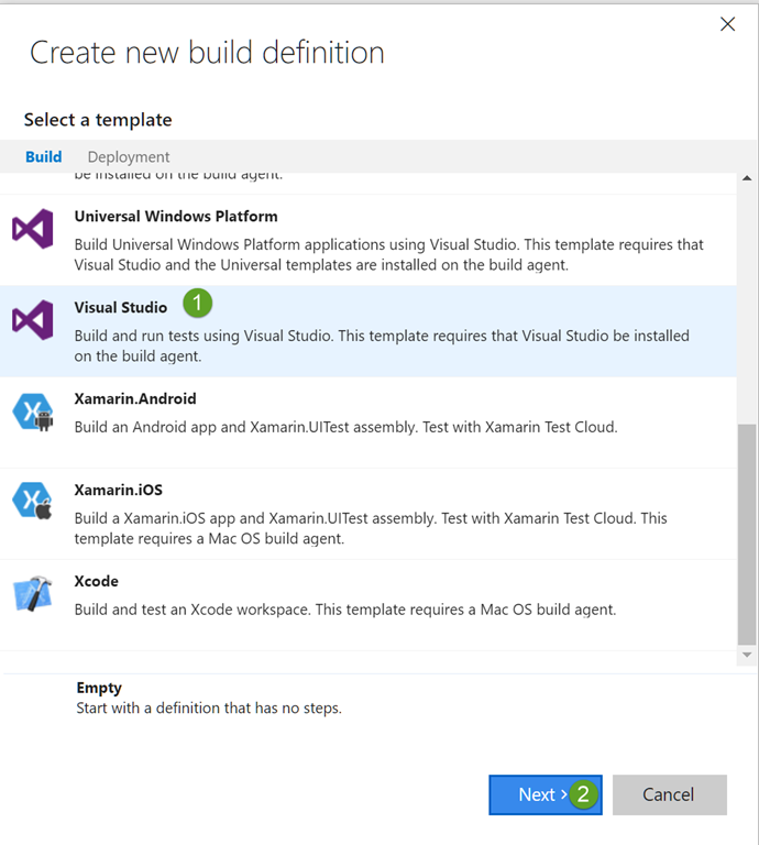 Choose the Visual Studio base template as this give us most of what we want and click Next.